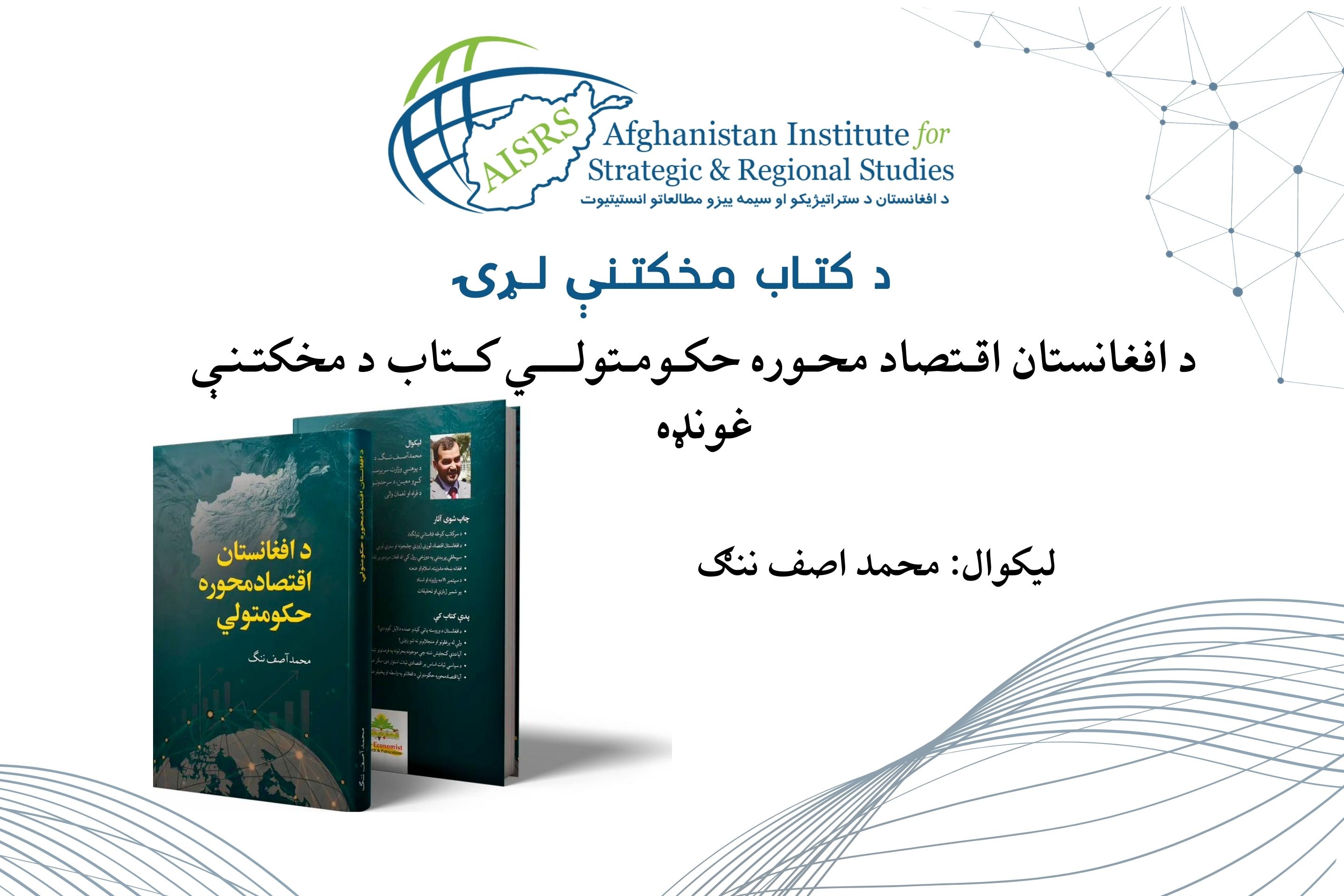 «د افغانستان اقتصاد محوره حکومتولي» کتاب محمد اصف ننګ لیکلی او پر ۱۴۰۳ لمريز کال د اقتصاد خپرندوی ټولنې له خوا چاپ شوی دی، چې د چاپ چارې يې د مسلم انسټېټيوټ مطبعې مخ ته وړي دي، دا اثر ۲۸۸ مخونه لري.